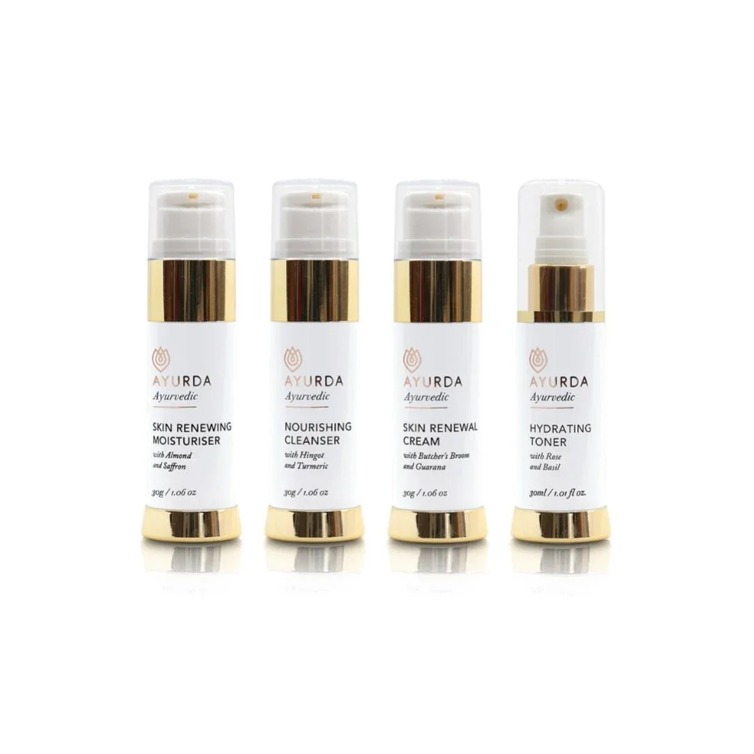 The Vata Nourish & Renew Sample Kit includes 3x 30g and 1x 30ml bottles - a cleanser, Toner, Moisturiser and Night cream all customised for your skin's optimal need.